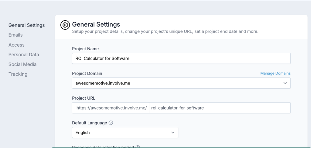 involve.me offers various configuration options. For example, in the General Settings, you can add your project name, project domain, your URL, select a language, etc.