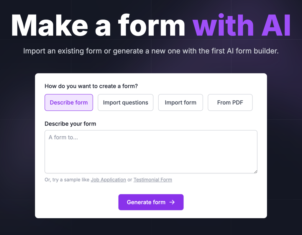 Generating questions for your brand can be a time-consuming process. Luckily, forms.app AI can create the perfect form for your website, all you need to do is tell it what kind of form you want for your website