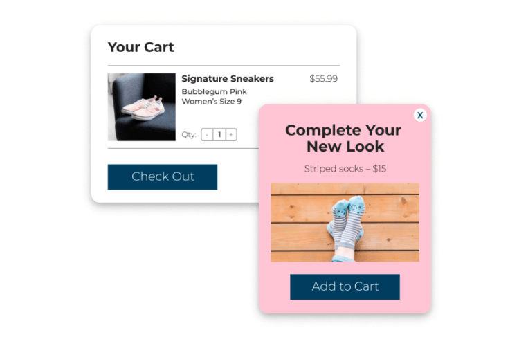 One way to think about upselling and cross-selling is the convenience it provides for customers. First, these pop ups show customers what they’re looking for in less time. People don’t always want to poke around your store to see what else it has to offer, so upselling and cross-selling streamlines the checkout process and gets customers from point A to point B efficiently.